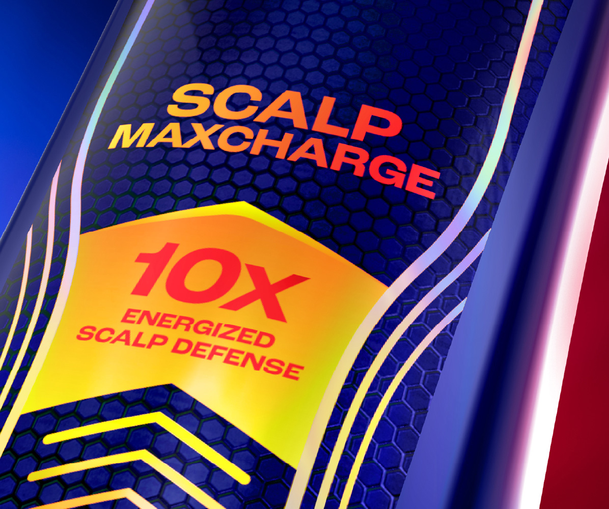Progressive arrows layered within the structure convey acceleration and momentum, building in intensity to culminate in the “10X Energized Scalp Defense” claim, positioning the product as delivering maximum scalp performance.